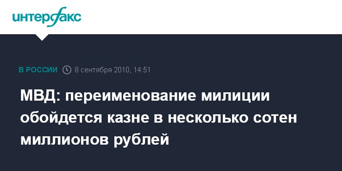 Москва. 8 сентября. INTERFAX.RU - Переименование российской милиции в полицию обойдется МВД в несколько сотен миллионов рублей, и эта сумма не скажется негативно на обеспечении полиции, заявил замминистра внутренних дел РФ Сергей Булавин.