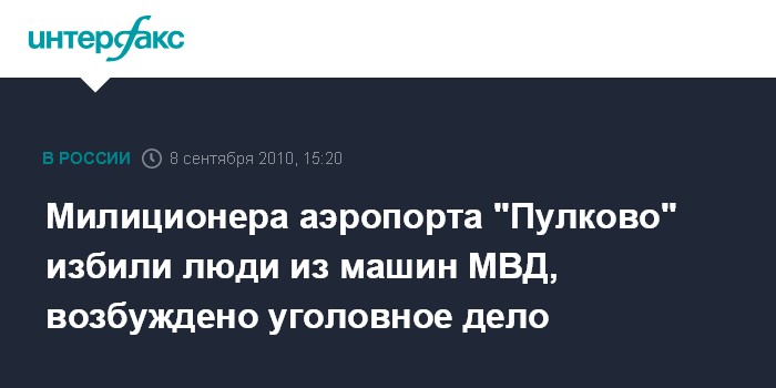 Как сообщает сайт ведомства в среду, 3 сентября 2010 года на территории, прилегающей к аэропорту "Пулково", несколько человек, находившихся в двух автомашинах Главного управления МВД РФ по Северо-Западному федеральному округу, напали на младшего инспектора службы отделения обеспечения общественного порядка.