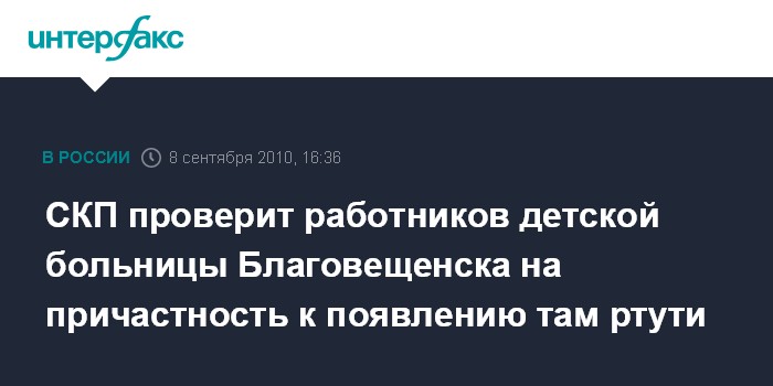 Москва. 8 сентября. INTERFAX.RU - Следственный комитет при прокуратуре начал проверку в отношении должностных лиц детской больницы Благовещенска, в здании которой была обнаружена ртуть, сообщил "Интерфаксу" официальный представитель СКП РФ Владимир Маркин.