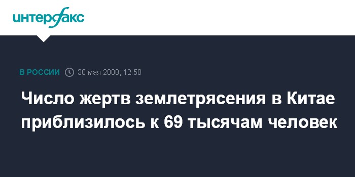 Москва. 30 мая. INTERFAX.RU - Количество погибших в результате разрушительного землетрясения в юго-западном Китае увеличилось до 68 858 человек, сообщает открытый сайт официального агентства "Синьхуа".