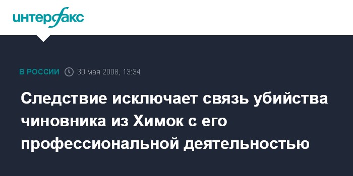 Москва. 30 мая. INTERFAX.RU - Убийство чиновника в Подмосковье никак не связано с его профессиональной деятельностью, заявили "Интерфаксу" в Следственном комитете при прокуратуре (СКП) РФ. "Следствие полностью исключает версию о совершении убийства в связи с профессиональной деятельностью потерпевшего", - заявил официальный представитель СКП РФ Владимир Маркин.