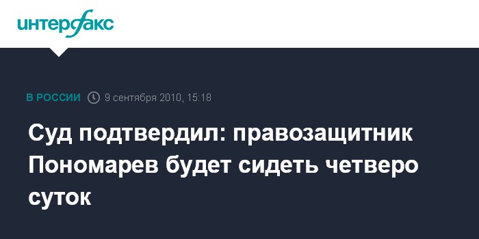 Москва. 9 сентября. INTERFAX.RU - Тверской суд Москвы признал законным назначение четырех суток административного ареста лидеру движения "За права человека" Льву Пономареву по обвинению в неповиновении законным требованиям сотрудника милиции в связи с акцией "День гнева" 12 августа.