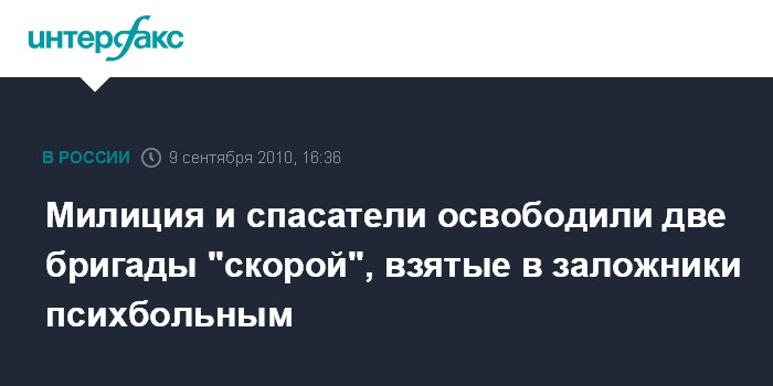 Москва. 9 сентября. INTERFAX.RU - В Зеленограде психически больной мужчина на протяжении нескольких часов удерживал в заложниках врачей двух бригад "скорой помощи", сообщил "Интерфаксу" источник в правоохранительных органах в четверг.
