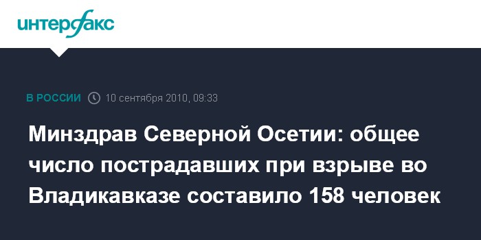 Москва. 10 сентября. INTERFAX.RU - По уточненным данным, 158 человек пострадали в результате теракта на центральном рынке Владикавказа в четверг.