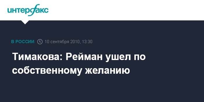 Москва. 10 сентября. INTERFAX.RU - Отставка Леонида Реймана с поста советника президента РФ произошла по его собственному желанию, подтвердила журналистам пресс-секретарь главы государства Наталья Тимакова.