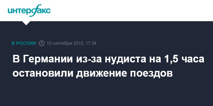 Берлин. 10 сентября. INTERFAX.RU - В городе Золинген на западе Германии из-за появления нудиста на железнодорожных путях в течение 1,5 часов было парализовано движение поездов, сообщает в пятницу журнал "Шпигель".