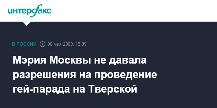 Москва. 30 мая. INTERFAX.RU - Столичные власти не согласовали проведение каких-либо пикетов или шествий на Тверской улице активистам гей-движения, сообщил "Интерфаксу" высокопоставленный источник в городской администрации. "Разрешения на проведение шествия, парада или пикета выдано не было", - сказал собеседник агентства, подчеркнув, что позиция городских властей остается неизменной. "Мэр Юрий Лужков в своих выступлениях относительно этого вопроса всегда имел четкую позицию: проведение подобного мероприятия в Москве недопустимо", - отметил собеседник агентства.