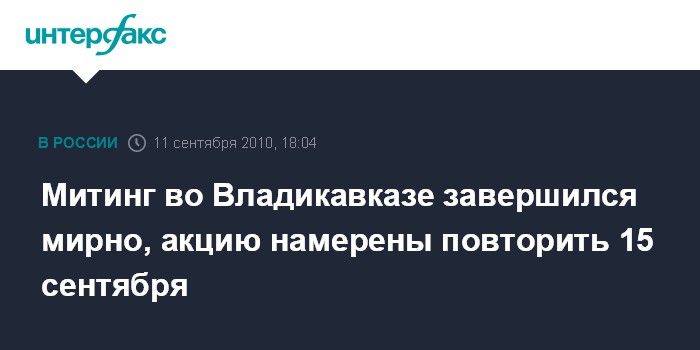 Владикавказ. 11 сентября. INTERFAX.RU - Примерно к 17:00 по московскому времени митингующие у Дома правительства во Владикавказе, требующие встречи с руководством республики, разошлись, обещав вернуться 15 сентября. "Сегодня мы не поговорили с тем, с кем хотели. Но 15 сентября на этом же месте, в два часа дня, мы вновь соберемся, чтобы пообщаться с руководством республики о нашей безопасности", - заявили организаторы митинга корреспонденту "Интерфакса".