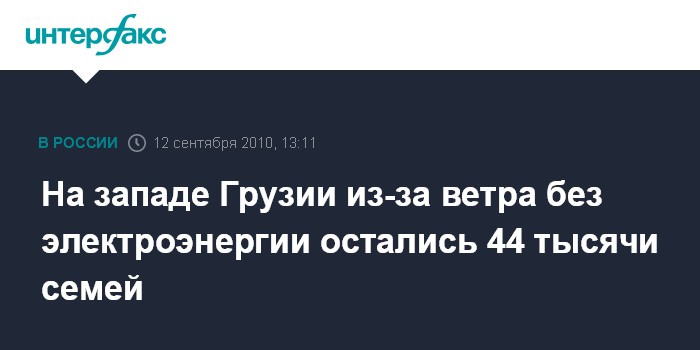 Тбилиси. 12 сентября. INTERFAX.RU - Сильный ветер, который с минувшей ночи бушует в Западной Грузии, повредил линии электропередач и вывел из строя фидеры. "В результате 44 тыс. абонентов остались без электроэнергии", - сообщил "Интерфаксу" в воскресенье руководитель пресс-службы компании Energo-Pro Georgia (бывшая "Объединенная энергокомпания Грузии") Автандил Двалишвили. По его словам, в регионах Гурия и Самегрело остались без электроэнергии 27 тысяч абонентов компании, в регионах Имерети и Рача-Лечхуми - 17 тысяч. В частности, лишилась электроэнергии часть населения городов Поти, Кутаиси, Зестафони.