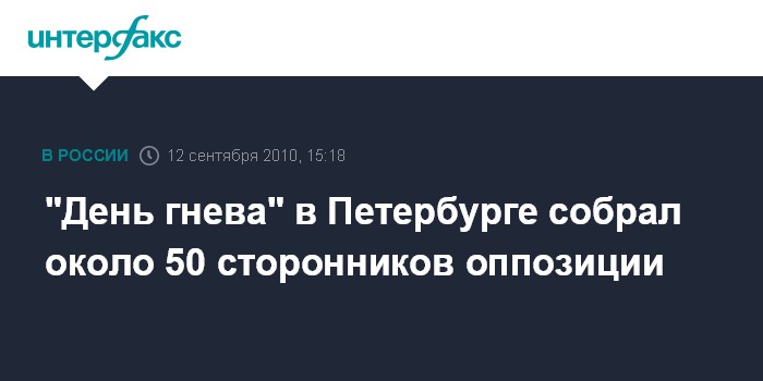 Санкт-Петербург. 12 сентября. INTERFAX.RU - Петербургские оппозиционеры в воскресенье провели митинг в рамках так называемого "Дня гнева". Одна из организаторов акции Тамара Ведерникова сообщила "Интерфаксу", что участники митинга потребовали отставки городских властей, пересмотра градостроительной политики, а также социализации бюджетной сферы. По ее словам, в акции приняли участие около 50 человек. Митинг прошел без столкновений с милицией, абсолютно мирно, в рамках закона.