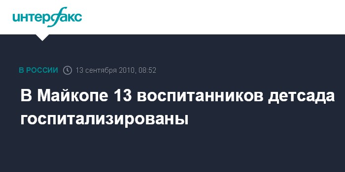 "В период с 9 по 13 сентября в инфекционную больницу города Майкопа поступили 13 детей в возрасте от 3 до 6 лет с подозрением на кишечную инфекцию. Все они - воспитанники одного из негосударственных детских садов столицы Адыгеи", - сказал собеседник агентства.