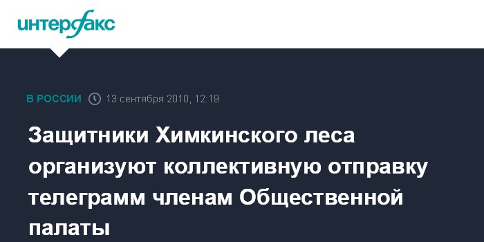 Москва. 13 сентября. INTERFAX.RU - Движение защитников Химкинского леса "Экооборона", "Солидарность" и организация "За права человека" во вторник в 18:30 организуют на Центральном телеграфе коллективную отправку телеграмм членам Общественной палаты, которые будут участвовать в общественных слушаниях по проекту автотрассы Москва - Санкт-Петербург через Химкинский лес.