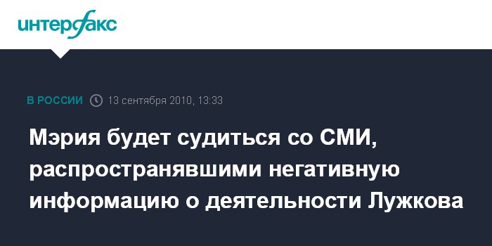 Москва. 13 сентября. INTERFAX.RU - Мэр Москвы Юрий Лужков и правительство столицы готовят иски в суды о защите чести и достоинства в связи с негативными телесюжетами и статьями в ряде СМИ.
