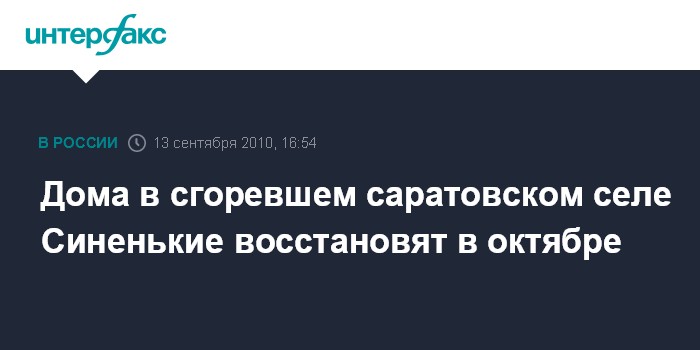 Саратов. 13 сентября. INTERFAX.RU - Восстановительные работы в селе Синенькие Петровского района Саратовской области, наиболее сильно пострадавшем от природных пожаров в начале сентября, будут закончены до конца октября.