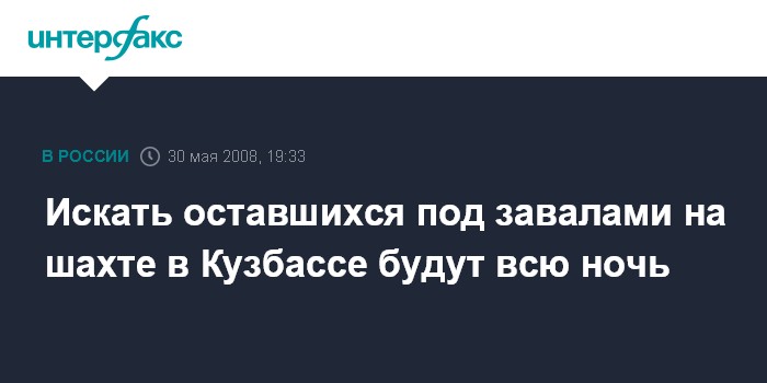 Кемерово. 30 мая. ИНТЕРФАКС-СИБИРЬ - Разборка завалов на шахте им. Ленина в Кемеровской области, где в пятницу произошел обвал породы, будет продолжаться всю ночь.