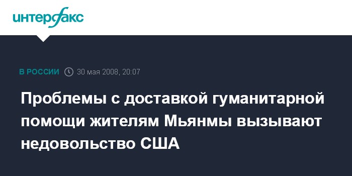Вашингтон. 30 мая. ИНТЕРФАКС - Слишком медленная доставка гуманитарной помощи людям, пострадавшим на юге Мьянмы (Бирмы) от урагана "Наргис", вызывает недовольство США, заявила в пятницу представительница Белого дома Дана Перино.