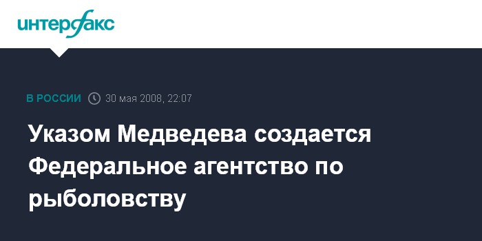 Москва. 30 мая. ИНТЕРФАКС - Президент России Дмитрий Медведев подписал указ "О Федеральном агентстве по рыболовству", сообщает пресс-служба Кремля в пятницу.