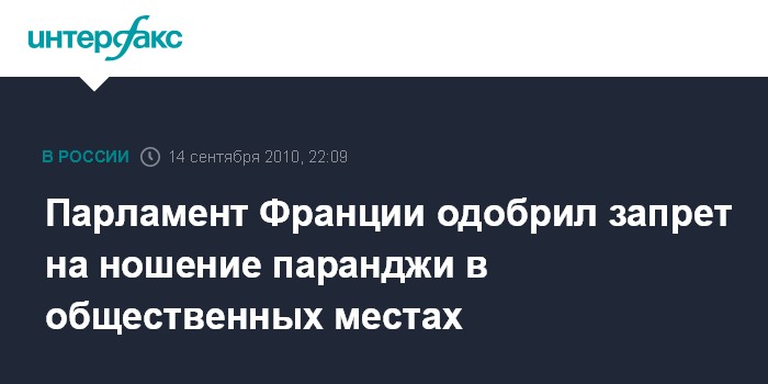 Париж. 14 сентября. INTERFAX.RU - Законопроект, предусматривающий введение запрета на ношение паранджи в общественных местах, одобрен парламентом Франции, информирует во вторник газета Le Figaro.