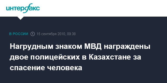Усть-Каменогорск. 15 сентября. INTERFAX.RU - В Восточно-Казахстанской области (ВКО) двое сотрудников Катон-Карагайского райотдела полиции за спасение человека награждены нагрудным знаком "За отличную службу в рядах МВД".
