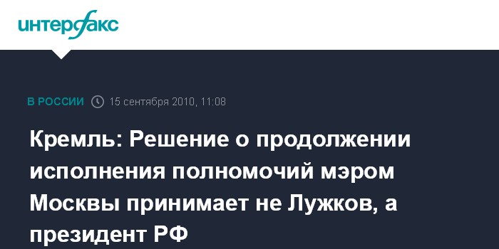 Кремль: Решение о продолжении исполнения полномочий мэром Москвы принимает не Лужков, а президент РФ