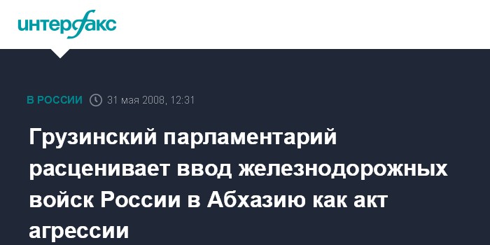 Тбилиси. 31 мая. ИНТЕРФАКС - Председатель временной комиссии грузинского парламента по вопросам восстановления территориальной целостности Шота Малашхия выразил уверенность, что ввод железнодорожных войск России на территорию непризнанной республики Абхазия будет признан актом агрессии против Грузии.