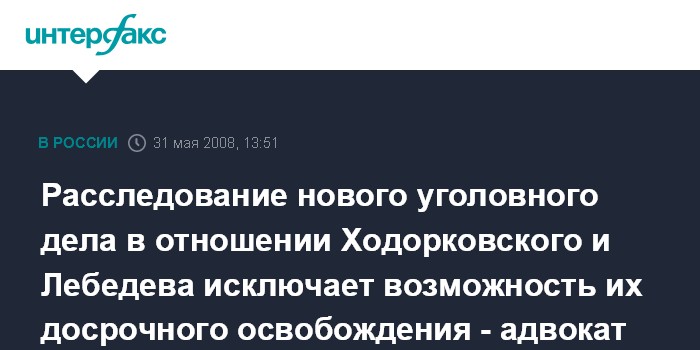 Расследование нового уголовного дела в отношении Ходорковского и Лебедева исключает возможность их досрочного освобождения - адвокат