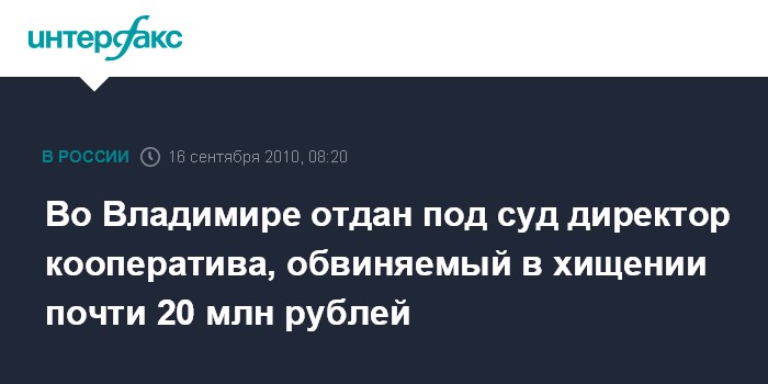 Во Владимире отдан под суд директор кооператива, обвиняемый в хищении почти 20 млн рублей