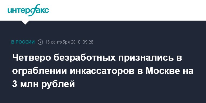 Москва. 16 сентября. INTERFAX.RU - На востоке Москвы задержаны четверо приезжих, которые в декабре прошлого года похитили у инкассаторов более 3 млн рублей, сообщил "Интерфаксу" в четверг источник в правоохранительных органах города.