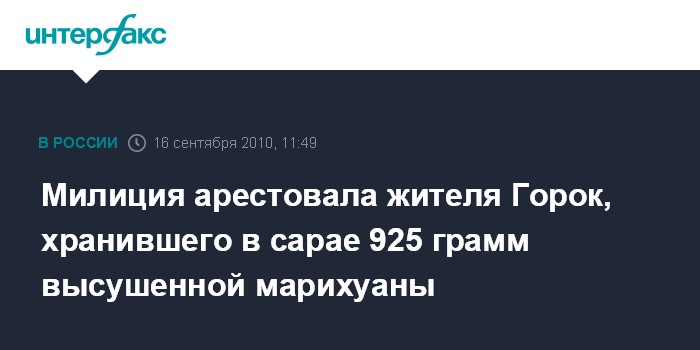 Могилев. 16 сентября. INTERFAX.RU - Милицией арестован житель Горок Могилевской области, который хранил в сарае 925 грамм высушенной марихуаны, сообщили агентству "Интерфакс-Запад" в отделении информации и общественных связей УВД Могилевского облисполкома.