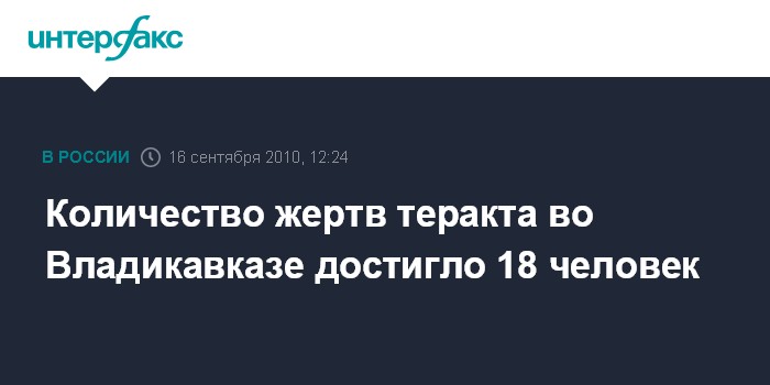 Таким образом, в результате подрыва автомобиля террористом-смертником возле центрального рынка во Владикавказе 9 сентября погибли, по последним данным, 18 человек (19-й - смертник), около 200 пострадали.