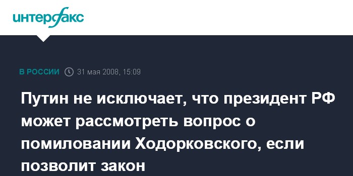 Париж. 31 мая. ИНТЕРФАКС - Премьер Владимир Путин заявил, что вопрос о возможности помилования экс-главы ЮКОСа Михаила Ходорковского находится в компетенции президента РФ, и полагает, что он может быть рассмотрен, если это позволят соответствующие нормы закона.