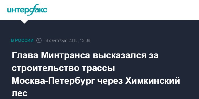 Москва. 16 сентября. INTERFAX.RU - Министр транспорта РФ Игорь Левитин не видит причин отказываться от проекта строительства трассы Москва-Петербург через Химкинский лес.
