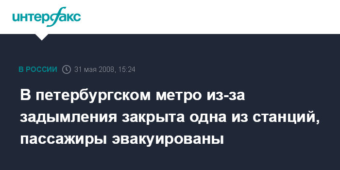 Санкт-Петербург. 31 мая. ИHТЕРФАКС СЕВЕРО-ЗАПАД - Hа станции метро "Проспект Большевиков" в Петербурге в субботу днем произошло задымление наклонного хода (эскалаторного тоннеля), сообщили "Интерфаксу" в ГУП "Петербургский метрополитен".