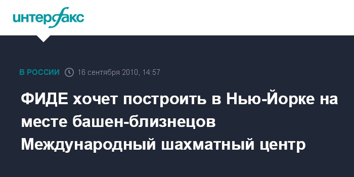 Москва. 16 сентября. INTERFAX.RU - Международная шахматная федерация (ФИДЕ) просит власти Нью-Йорка продать место, на котором находились башни-близнецы, для создания Всемирного шахматного центра, заявил президент ФИДЕ Кирсан Илюмжинов на пресс-конференции в четверг.