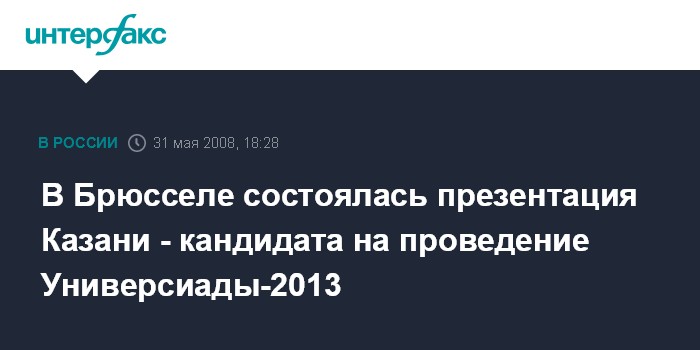 Казань/Брюссель. 31 мая. ИНТЕРФАКС-ПОВОЛЖЬЕ - Финальная презентация столицы Татарстана Казани в качестве кандидата от России на проведение XXVII Всемирной летней Универсиады 2013 года прошла на заседании исполкома Международной федерации студенческого спорта (FISU, Federation International Sports University) в субботу в Брюсселе (Бельгия).