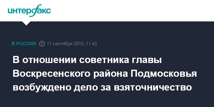 Москва. 7 сентября. – INTERFAX.RU – Уголовное дело возбуждено в отношении советника главы Воскресенского муниципального района Московской области, уличенного в получении взятки - 8 млн рублей.