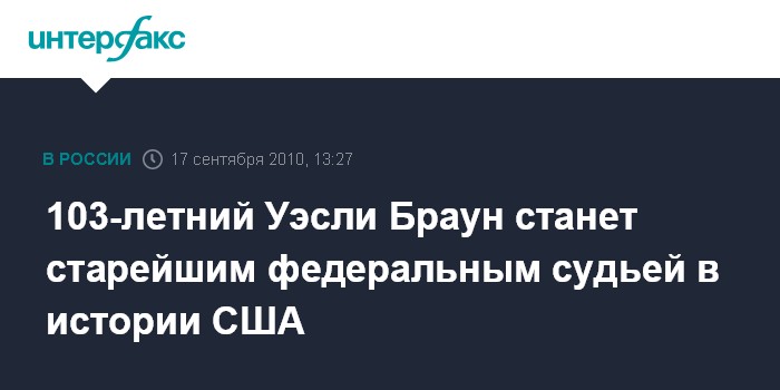 Вашингтон. 17 сентября. INTERFAX.RU - Менее чем через год 103-летний Уэсли Браун, как ожидается, станет старейшим действующим федеральным судьей в истории США, сообщила газета "Нью-йорк таймс".