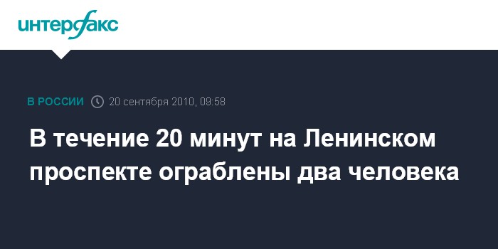 Москва. 20 сентября. INTERFAX.RU - Всего 20 минут понадобилось злоумышленнику на ограбление двоих человек на юго-западе Москвы, сообщил "Интерфаксу" источник в правоохранительных органах в понедельник.