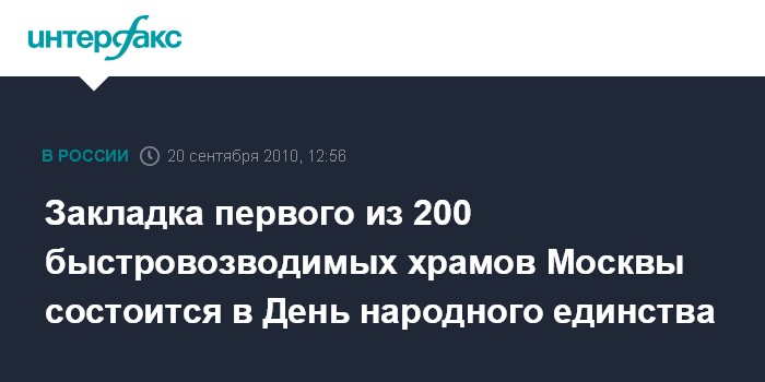 20 сентября. INTERFAX.RU - Закладка первого быстровозводимого храма в Москве из двухсот, которые предполагается построить за три-четыре года, состоится 4 ноября, в день празднования Казанской иконы и Дня народного единства, сообщил порталу "Интерфакс" глава Финансово-хозяйственного управления Московской патриархии епископ Подольский Тихон.