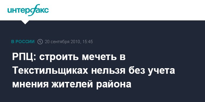 Москва. 20 сентября. INTERFAX.RU - В Русской православной церкви считают, что при решении вопроса о строительстве мечети в Текстильщиках необходимо учитывать мнение местных жителей.