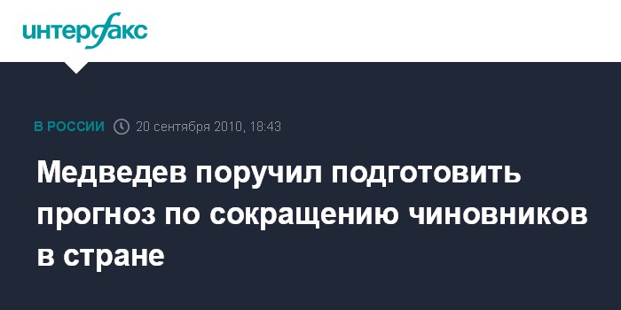 Москва. 20 сентября. INTERFAX.RU - Президент РФ Дмитрий Медведев дал задание правительству спрогнозировать объемы сокращения чиновников в ближайшие годы. Запись об этом содержится в твиттере Медведева. "Поручил администрации и правительству подготовить прогноз по сокращению чиновников в ближайшие годы", - говорится в записи.