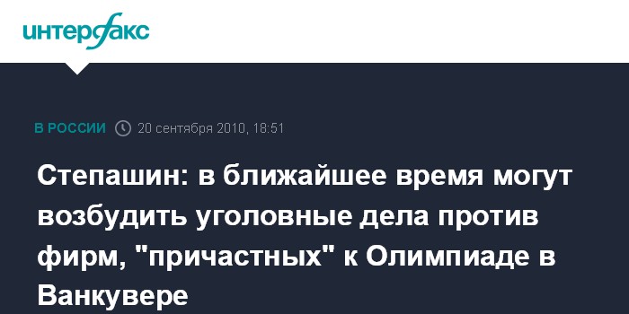 Москва. 20 сентября. INTERFAX.RU - Глава Счетной палаты РФ Сергей Степашин не исключает, что в ближайшее время будут возбуждены уголовные дела в отношении коммерческих структур, которые нецелевым образом использовали средства, выделенные на подготовку зимней Олимпиады в Ванкувере.