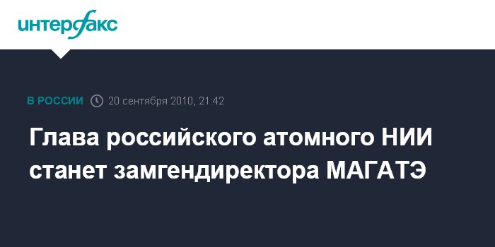 Вена. 20 сентября. INTERFAX.RU - Заместителем генерального директора МАГАТЭ в 2011 г. станет директор "Научно-исследовательского института атомных реакторов" (НИИАР, Димитровград, Ульяновская область) Александр Бычков.