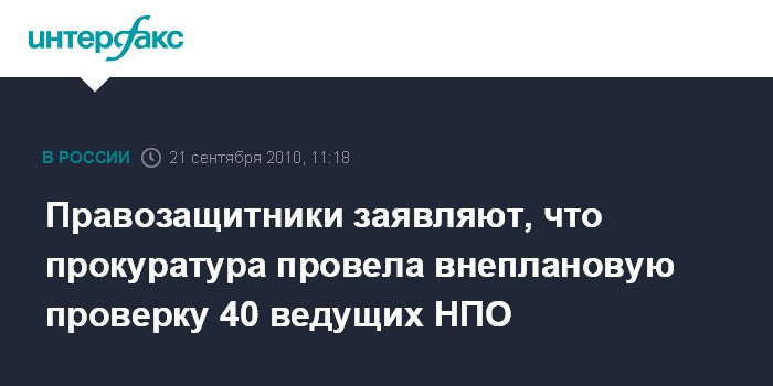 В заявлении НПО, поступившем в "Интерфакс" во вторник, говорится, что органы прокуратуры на днях провели внеплановую проверку 40 известных российских некоммерческих организаций.
