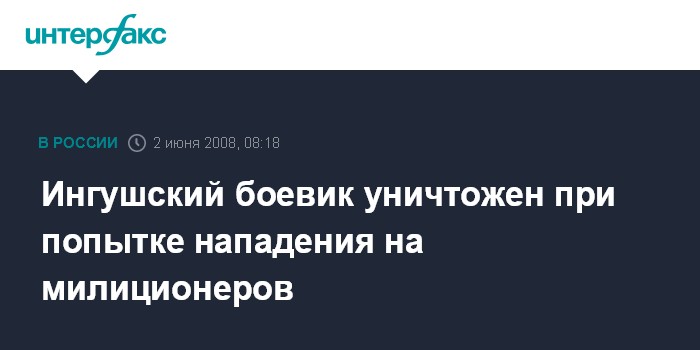 Назрань. 2 июня. INTERFAX.RU - Милиция ингушского города Карабулак уничтожила в минувшую субботу участника незаконного вооруженного формирования, сообщили агентству "Интерфакс-Юг" в пресс-службе МВД Ингушетии.