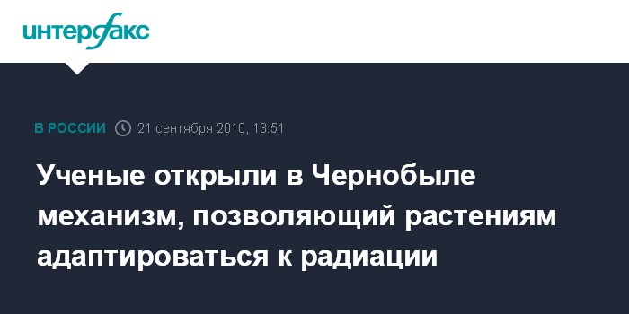 Вашингтон. 21 сентября. INTERFAX.RU - Исследования белков в семенах сои и льна, выросших в радиоактивной зоне Чернобыля, позволили генетикам из Словакии обнаружить механизм адаптации растений к среде с высоким уровнем радиации, пишет во вторник американская газета The New York Times со ссылкой на публикацию ученых Академии наук Словакии в журнале Enviromental Science and Technology.