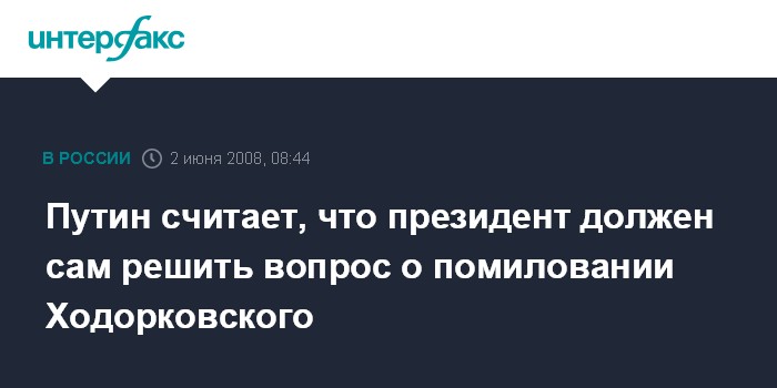 Париж. 2 июня. INTERFAX.RU - Премьер-министр России Владимир Путин заявил, что вопрос о помиловании экс-главы "ЮКОСа" Михаила Ходорковского находится в компетенции президента РФ, и теоретически он может быть рассмотрен, если это позволит закон.