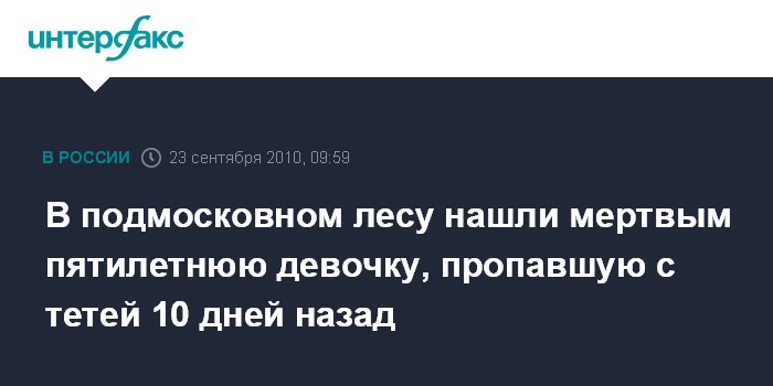 Москва. 23 сентября. INTERFAX.RU - В Подмосковье обнаружена погибшей девочка, без вести пропавшая вместе со своей тетей больше недели назад, сообщил "Интерфаксу" в четверг начальник управления информации и общественных связей ГУВД Московской области Евгений Гильдеев.