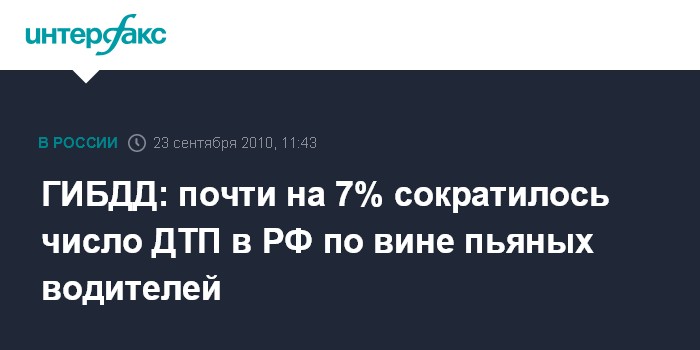 Москва. 23 сентября. INTERFAX.RU - Госавтоинспекция сообщает об уменьшении количества аварий на российских дорогах, произошедших по вине пьяных водителей, также уменьшилось и число жертв в результате таких ДТП.