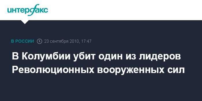 Богота. 23 сентября. INTERFAX.RU - Хорхе Брисеньо Суарес, один из наиболее влиятельных лидеров повстанческой группировки Революционные вооруженные силы Колумбии (РВСК), убит в ходе столкновения в центральном колумбийском департаменте Мета, сообщила в четверг колумбийская радиосеть "Караколь" со ссылкой на местный военный источник.